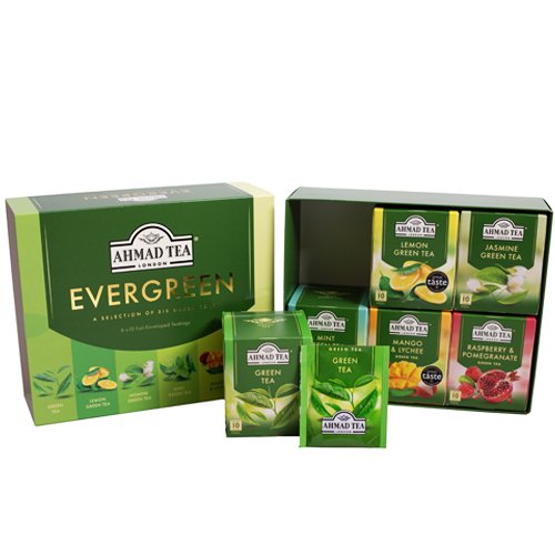 Ahmad Tea Evergreen selection with 6 different kinds of green tea: Green tea, Mint green tea, Jasmine green tea, Lemon green tea, Mango & Lychee green tea and green tea with raspberry and pomegranate.Tea bags with strings, individually foil wrapped, allow preserving the tea, flavour and aroma. Brewing should take approximately 3-5 minutes.