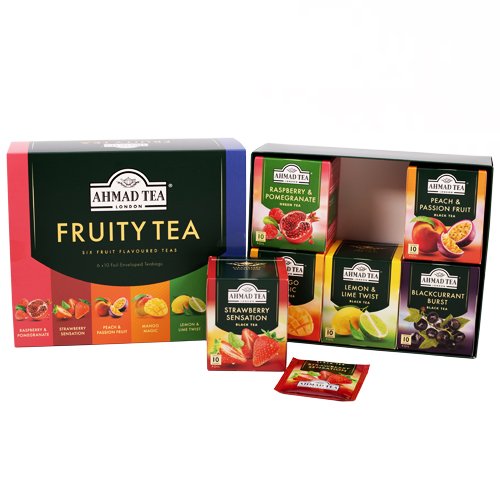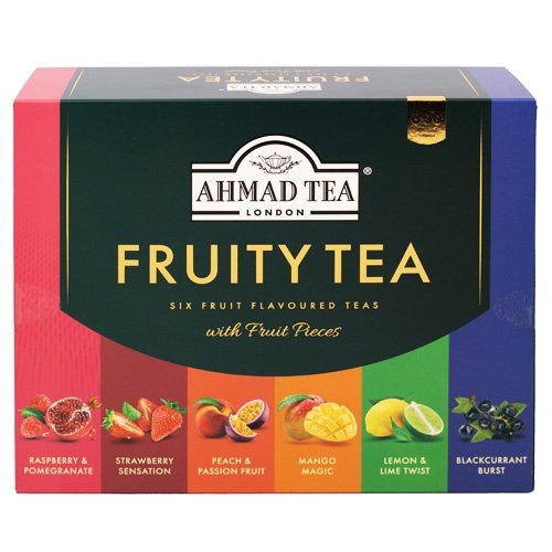 Ahmad Tea Fruitytea selection with 6 different kinds of fruit tea: Black fruity tea ’’Lemon and Lime Twist’’, green tea with strawberry and kiwi, black fruity tea ’’Blackcurrant Burst’’ , black fruity tea ’’Raspberry Indulgence’’, green tea ’’Blueberry Brilliance’’ and black fruity tea with peach and passion fruit. Tea bags with strings, individually foil wrapped, allow preserving the tea ,flavour and aroma.Brewing should take approximately 3-5 minutes.